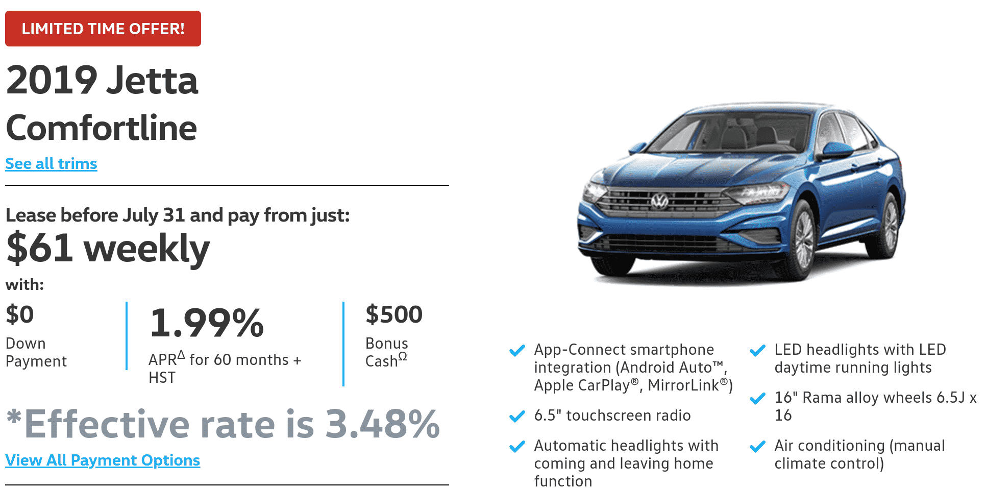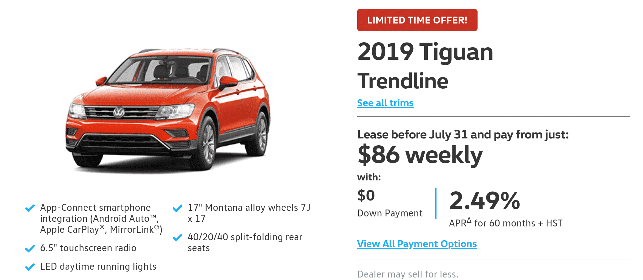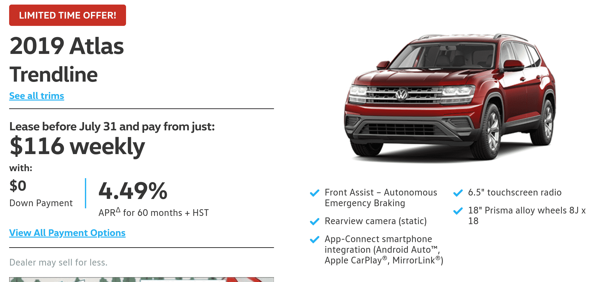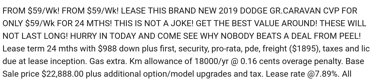 The Dodge Caravan lease below looks quite promising at $59/week however once you factor in the down payment, plus fees, plus freight, it becomes quite expensive. The way they advertise their vehicle below is technically not even allowed by OMVIC law. Unless a minivan is a MUST, this may not be the best choice.