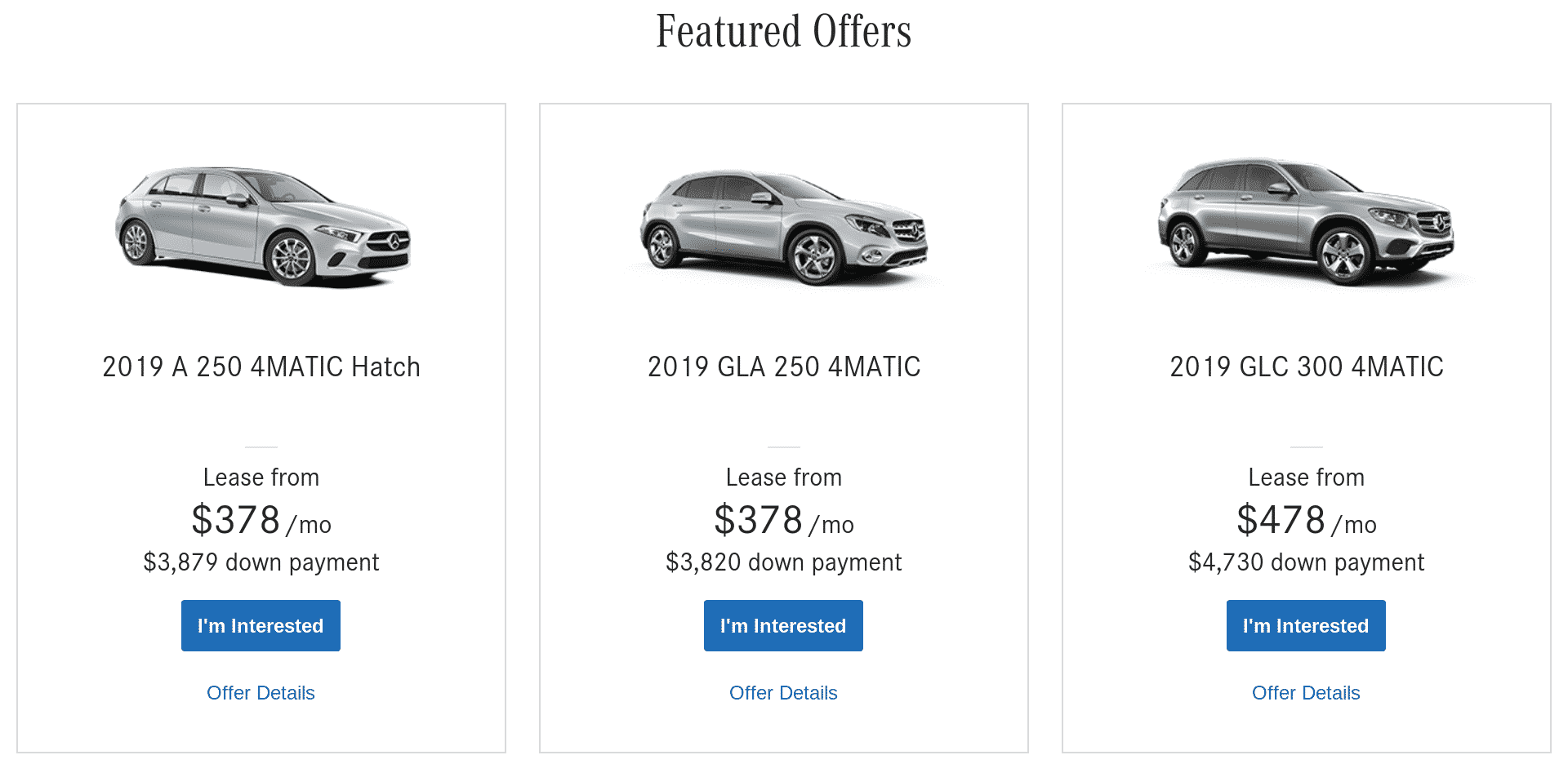 Mercedes is consistent in their program offerings this month. Their C300 is a unique value especially considering that for an additional $800 down-payment, you could jump into a slightly smaller vehicle than the Mazda, however its a Mercedes.