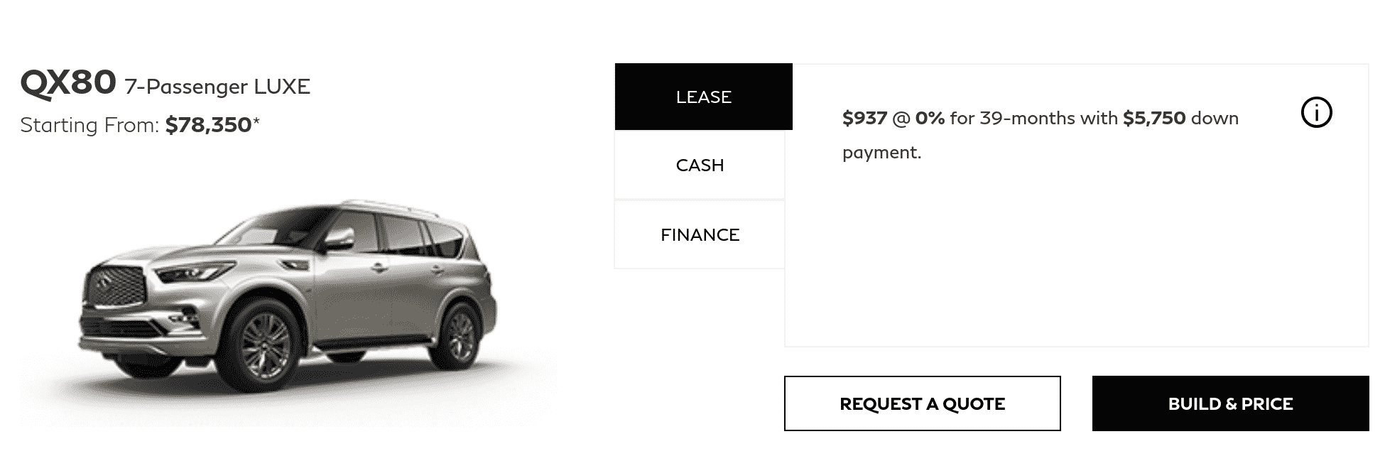 The QX80 still remains a fantastic option for a luxury full-size 7 seater with a sub $1000 monthly payment. You won’t find many other luxury manufacturers competitive on a short term lease offering like this.