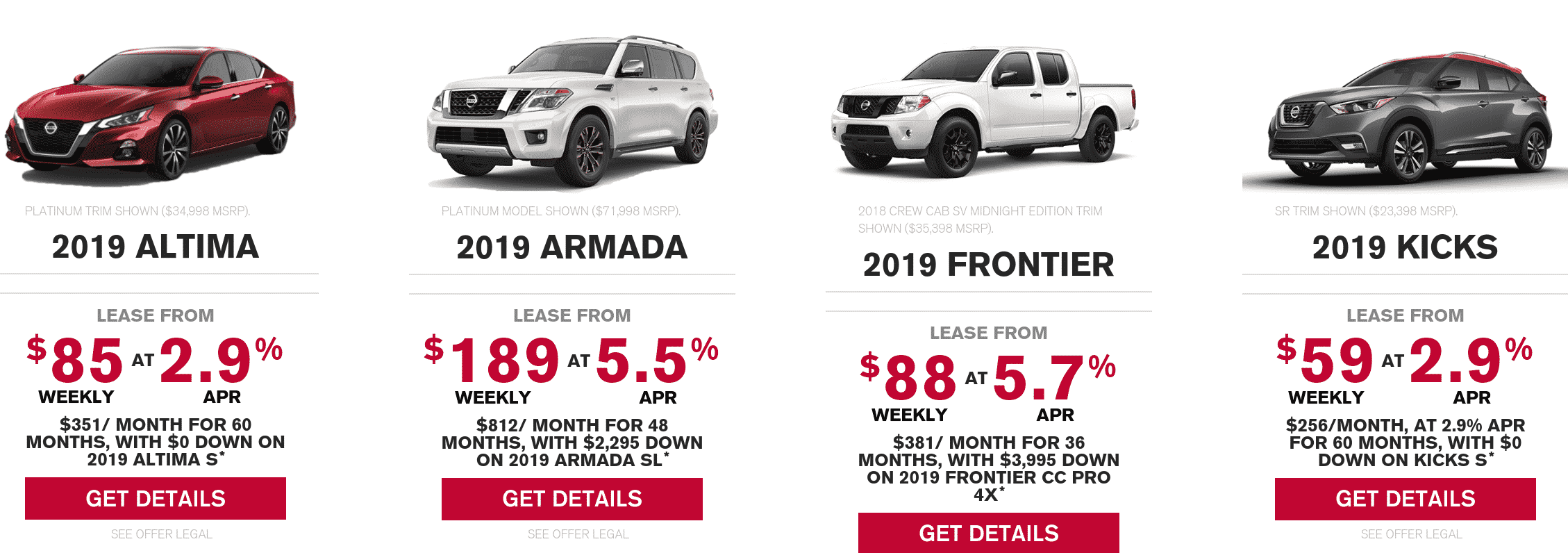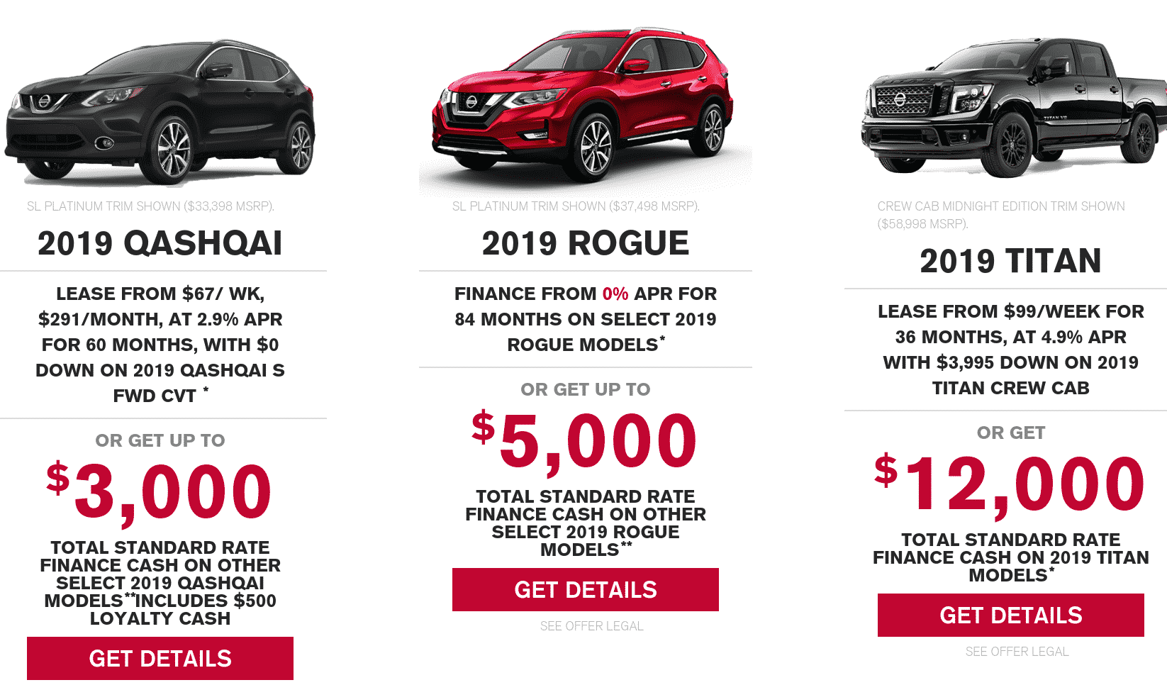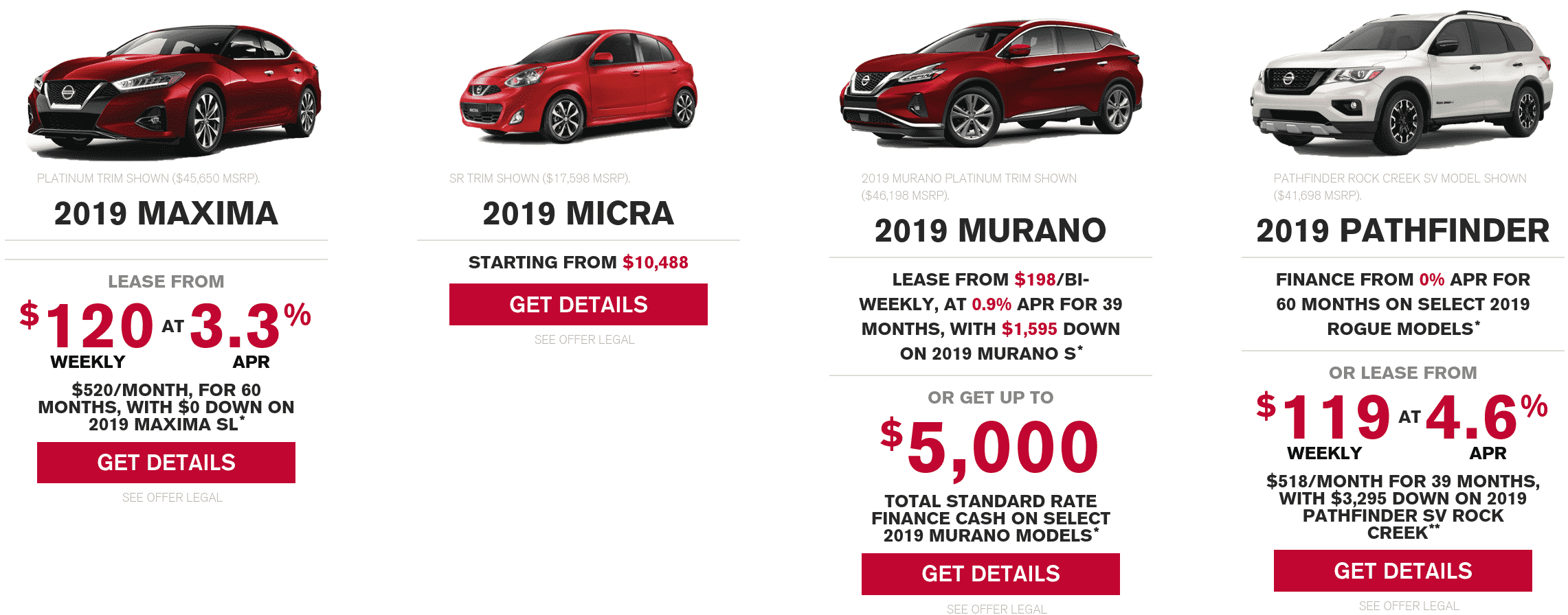 The 2019 Nissan Qashqai offers fantastic value for $0 down. You can’t go wrong. Also following suite to Infiniti’s QX80, the Nissan Pathfinder comes well equipped at an extremelly humble price-point.