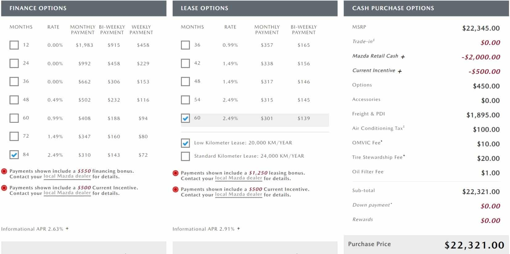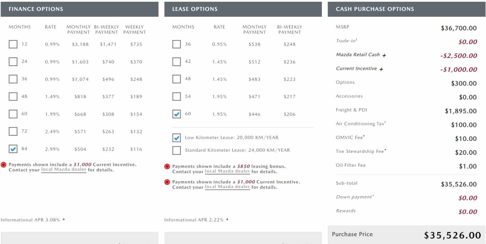 Looks like Mazda decided to revert back their website back to advertising specific offers on their website, rather than having you click into the vehicle. Mazda has maintained a consistent offering over last month’s programs.