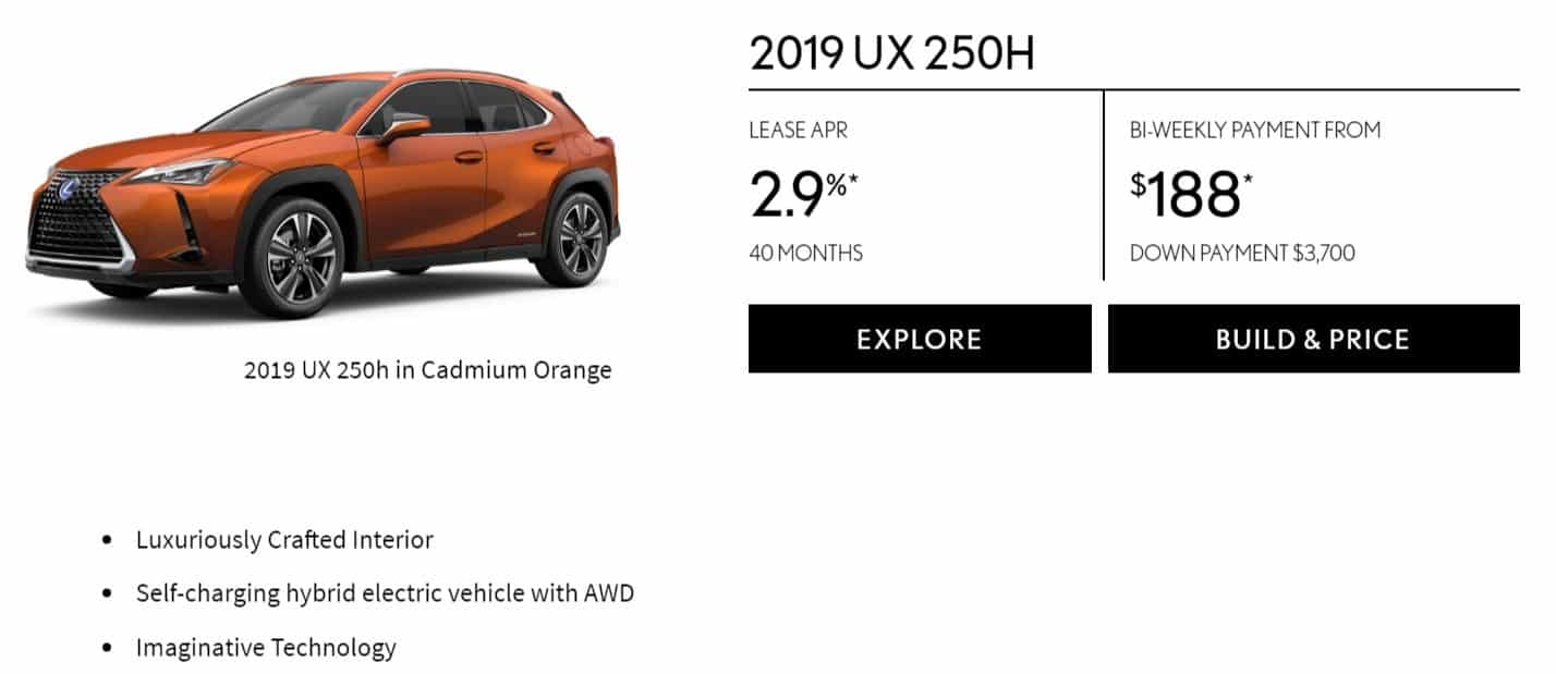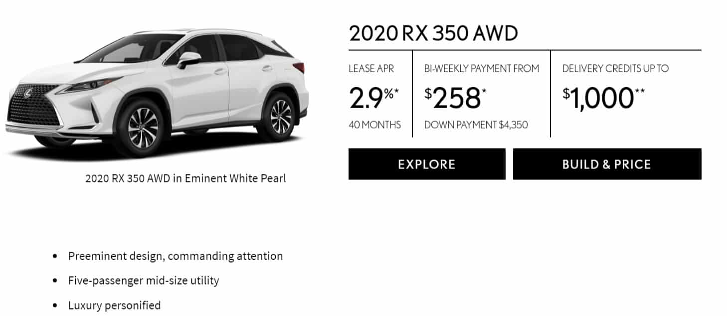 Although I am a fan of the RX 350 lease, this month is not as strong as it should be considering you can get a very similarly priced 2020 Acura RDX for the same price. If you’re a big fan of this model this would be your last chance to get the 2019 before they are all gone. So that being said, expect a good Canada car deal this month before there are none left.
