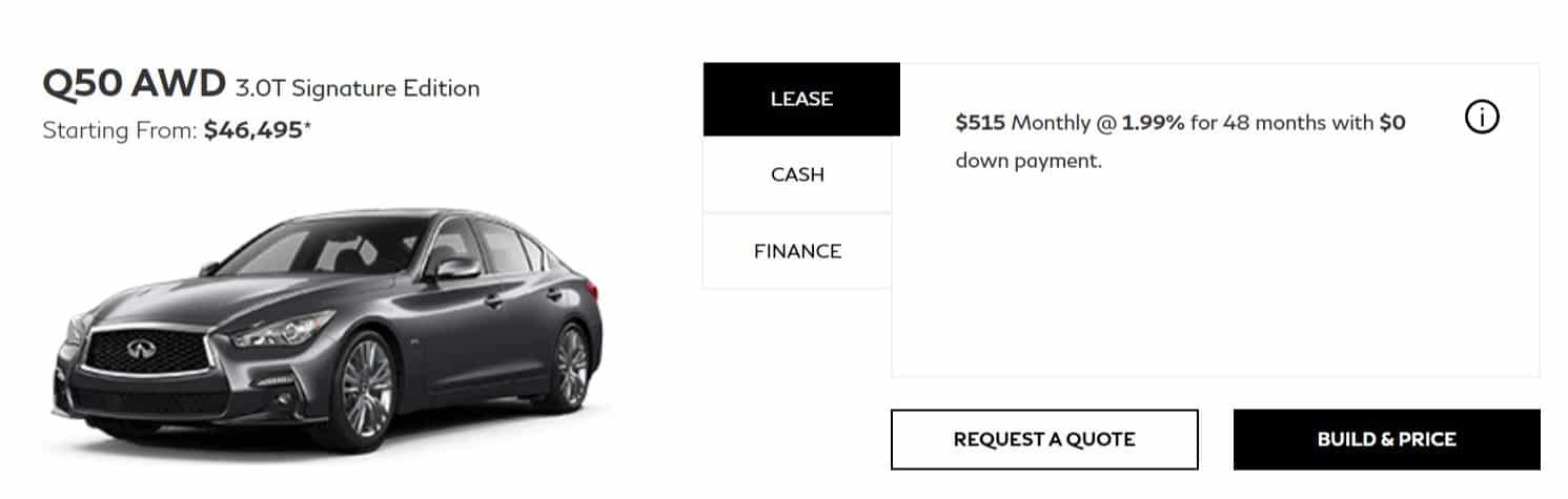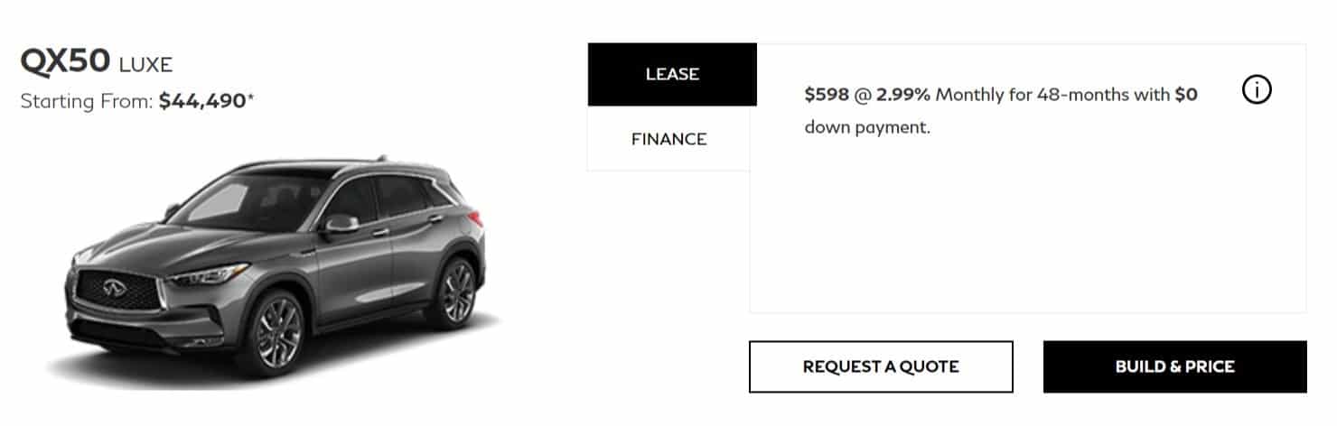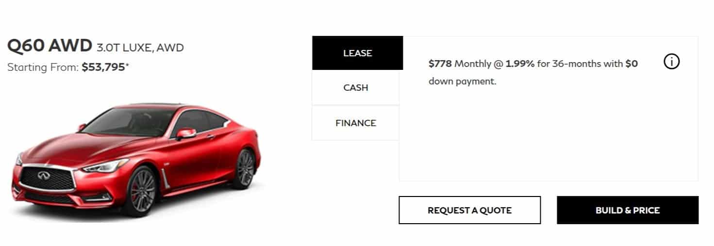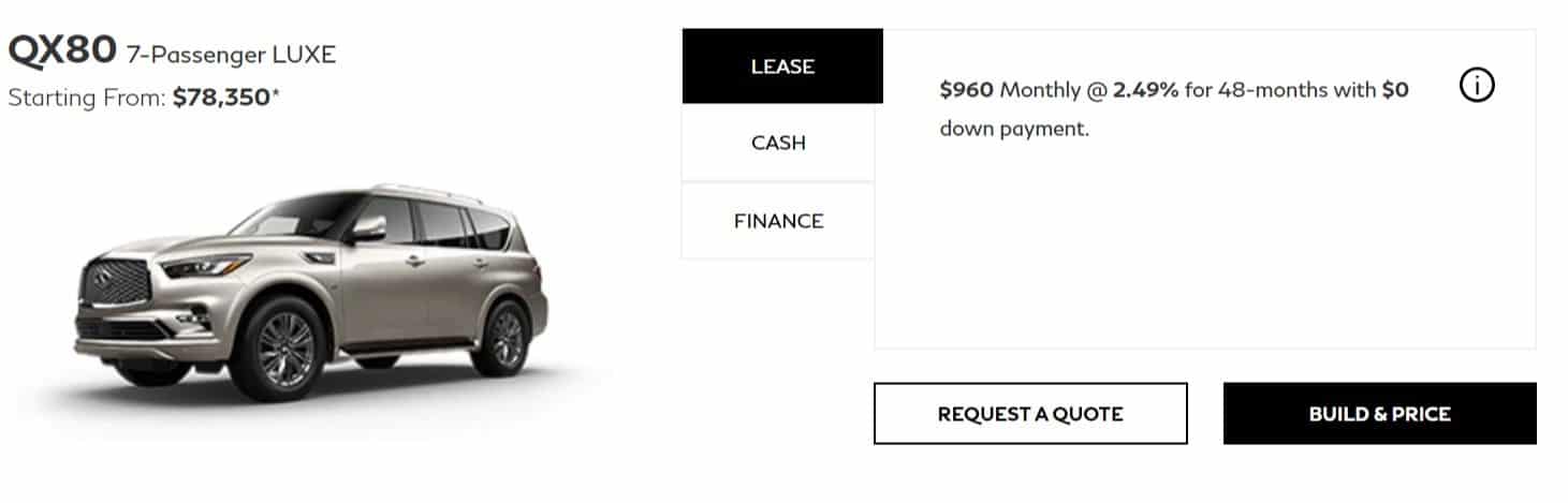 The Infiniti QX80 is a magnificent lease for under $1,000 a month considering it’s only a 4-year obligation this is of considerable value with a low interest rate to boot. Get additonal car discounts when you purchase through a Conquest Cars Canada certified consultant.