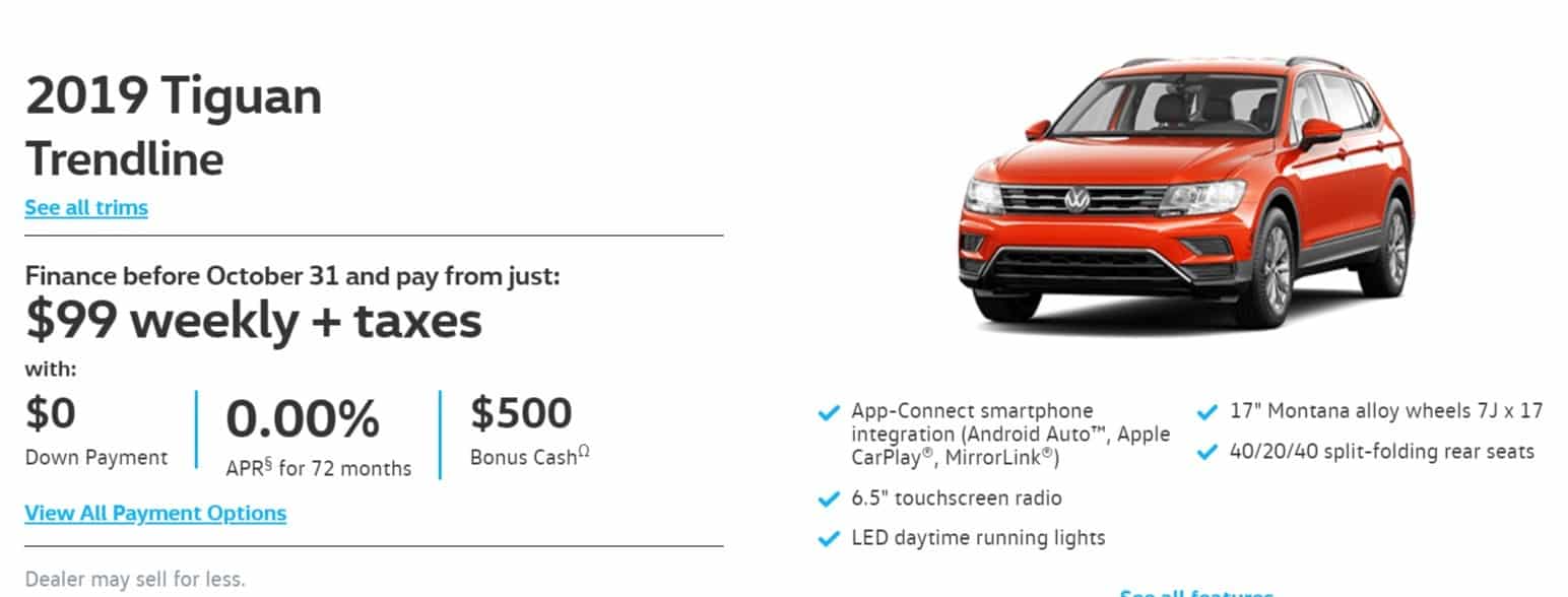5 Seater SUV: 2019 Volkswagen Tiguan Lease, $199 biweekly, $0down, 4 years