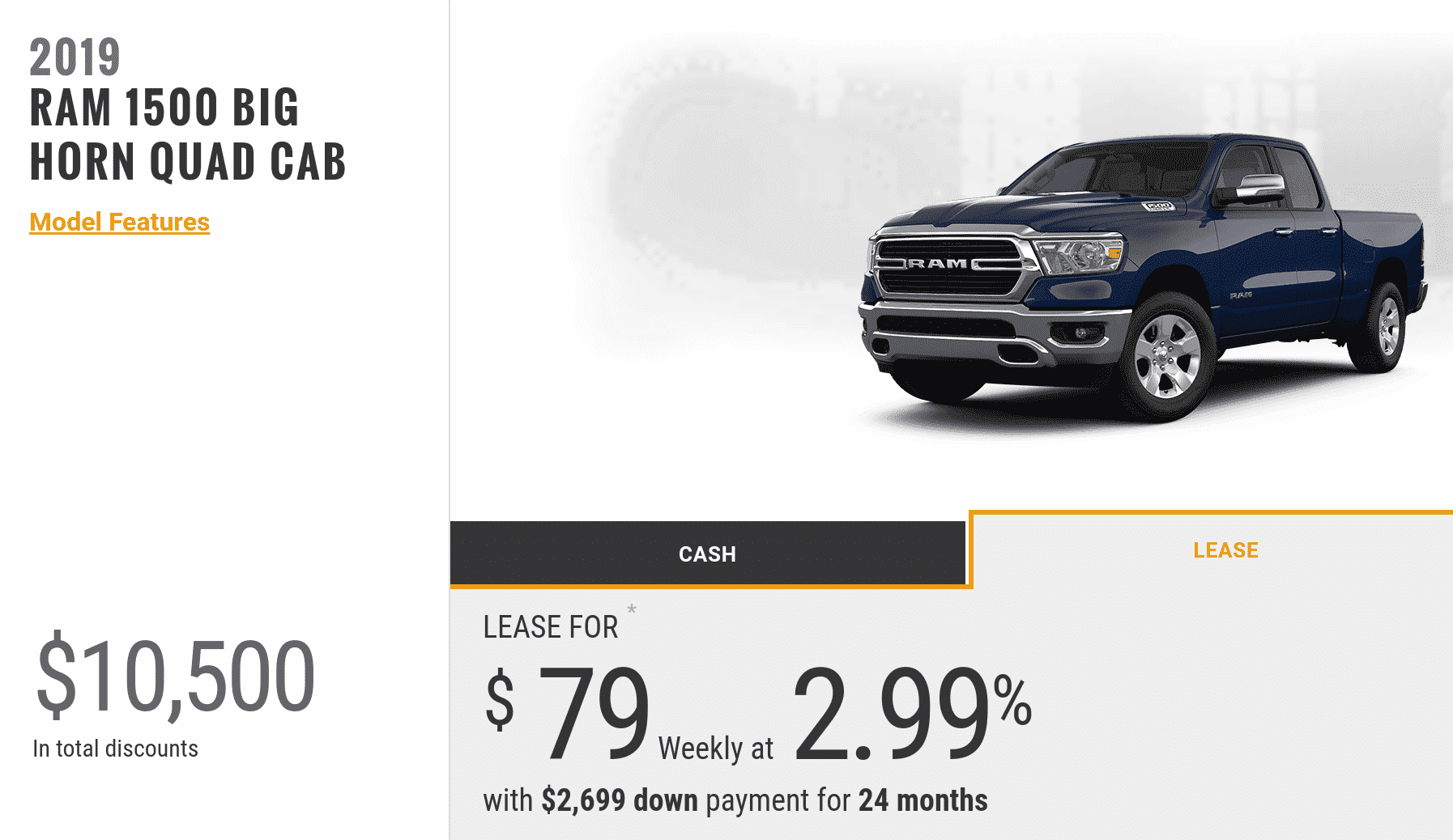The 2019 Dodge Ram is Dodge’s only salvation this month. Arguably, you won’t find a better payment on a 2 year lease. GM trucks are advertised this month at a lease payment closer to $100 weekly, with closer to $4000 down – provided, they come with more standard options at that price point.