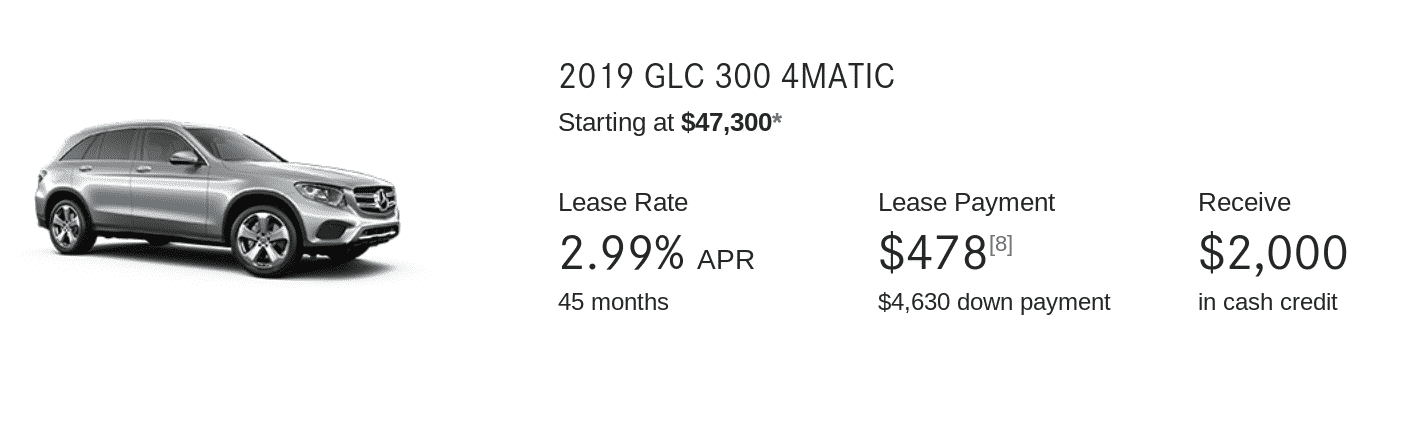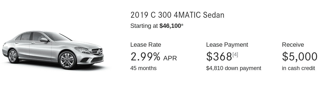 Mercedes is consistent in their program offerings this month. Their C300 is a unique value especially considering that for an additional $800 down-payment, you could jump into a slightly smaller vehicle than the Mazda, however its a Mercedes.