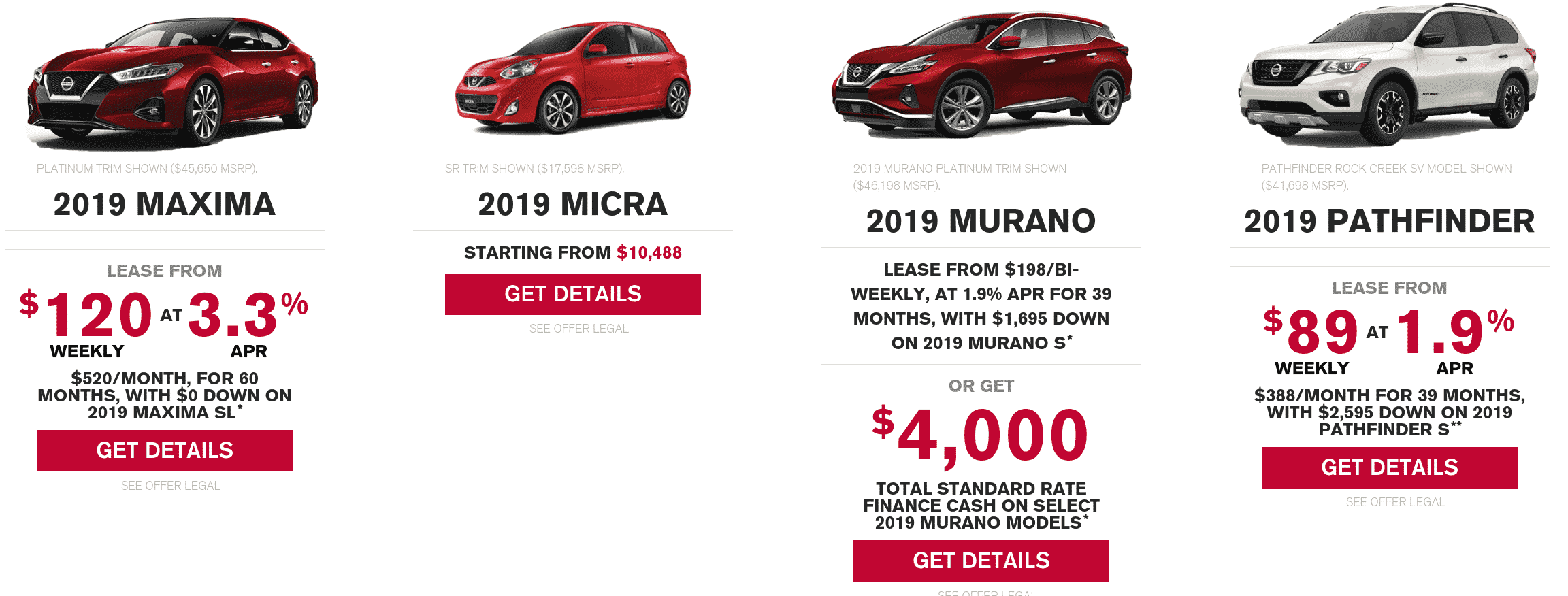 The 2019 Nissan Qashqai offers fantastic value for $0 down. You can’t go wrong. Also following suite to Infiniti’s QX80, the Nissan Pathfinder comes well equipped at an extremelly humble price-point. Pinch to zoom