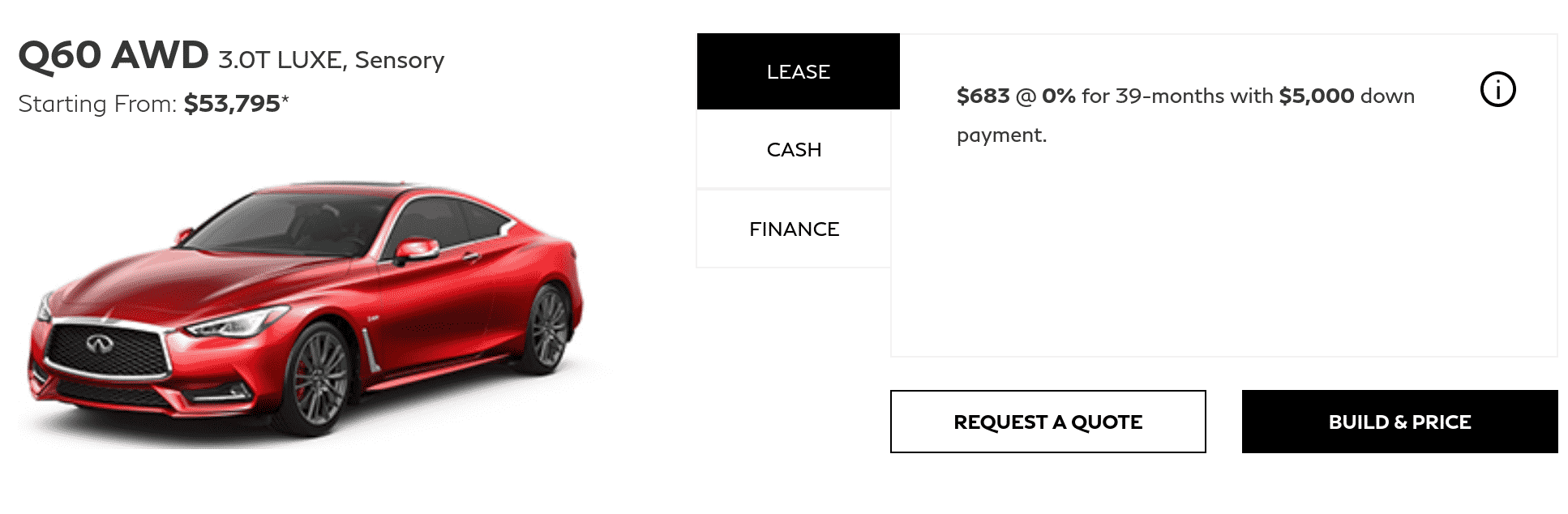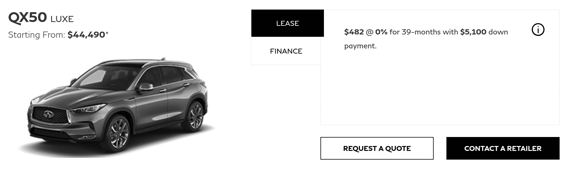 The QX80 still remains a fantastic option for a luxury full-size 7 seater with a sub $1000 monthly payment. You won’t find many other luxury manufacturers competitive on a short term lease offering like this.