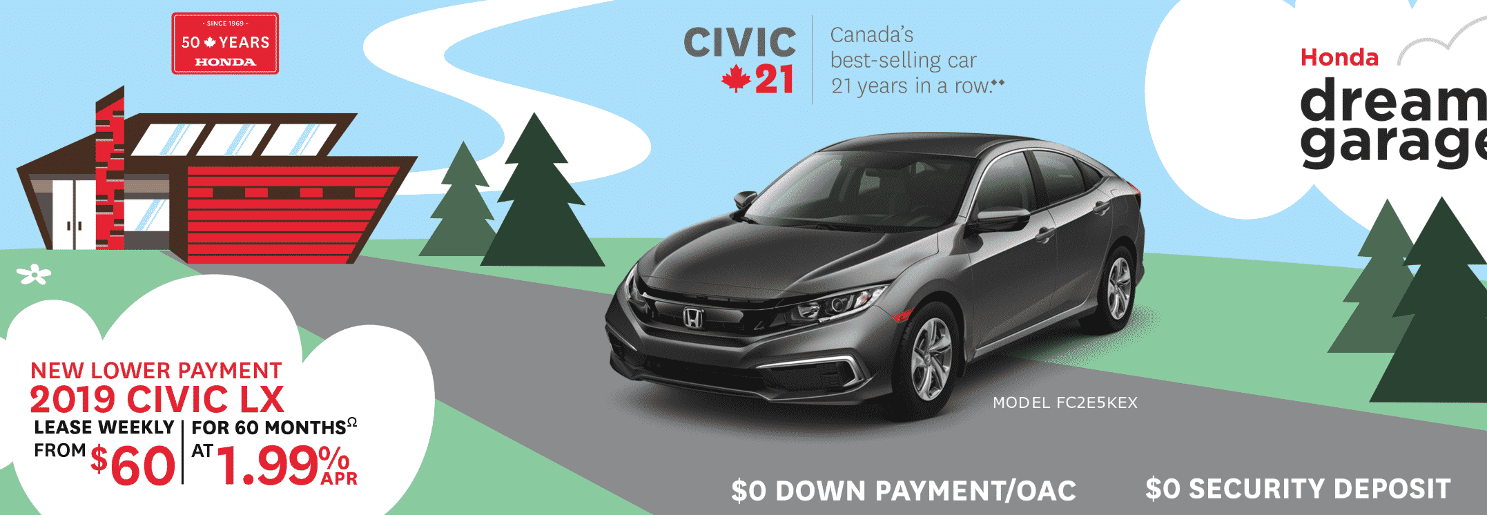 The 2019 Honda Civic offers one of the most competitive lease payments for compact sedans on the market right now due to the low weekly payment, and $0 down payment. Although the lease term is 5 years, the vehicle is extremely reliable. The only other compact car that compares in option is the Toyota Corolla which has a similar monthly payment and may end up being cheaper on insurance.