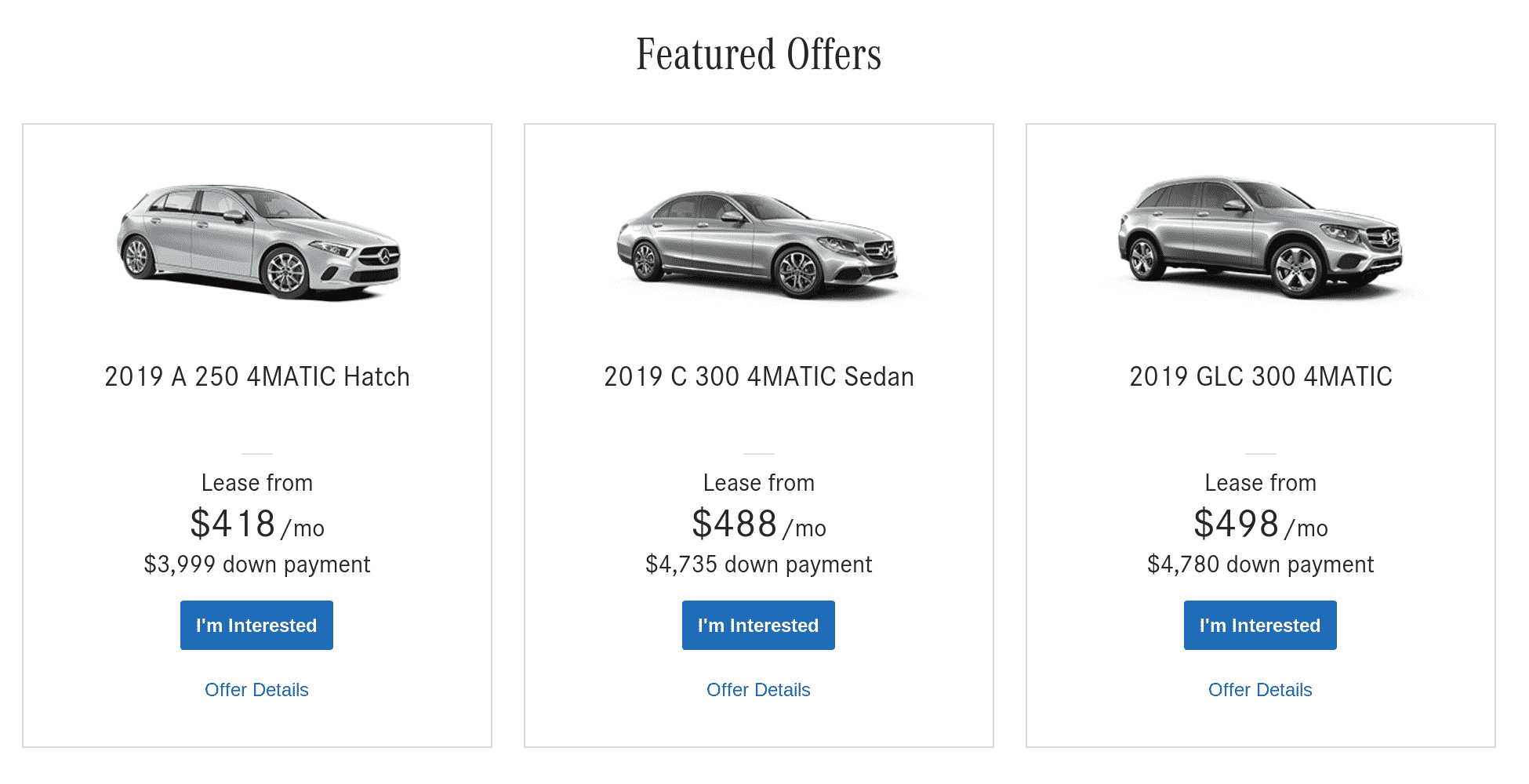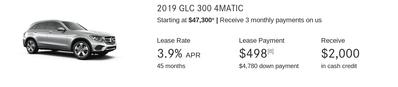 As mentioned in the above regarding the Acura RDX lease, you may find yourself more compelled to look at the 2019 GLC 300 from Mercedes. With a less downpayment, and a cheaper monthly payment, this vehicle will yield an exceptional ownership experience. The value is quite good. BMW has yet to put out their March offerings, however the above Mercedes leases are strong luxury contenders if you have money to put down.
