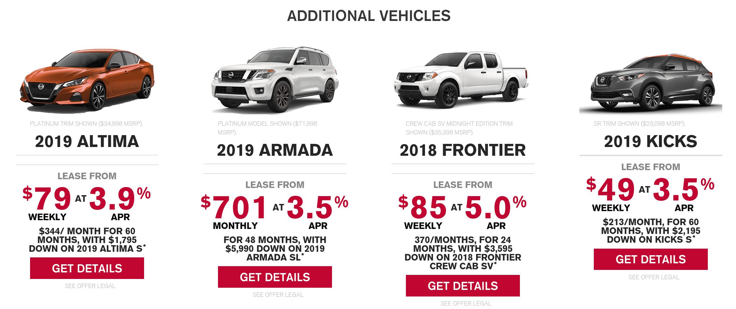 The 2019 Nissan Armada offers a full size SUV experience for nearly a sub $700 monthly payment. If you need space for 7 seats, and room for hockey bags, this may be a good option.