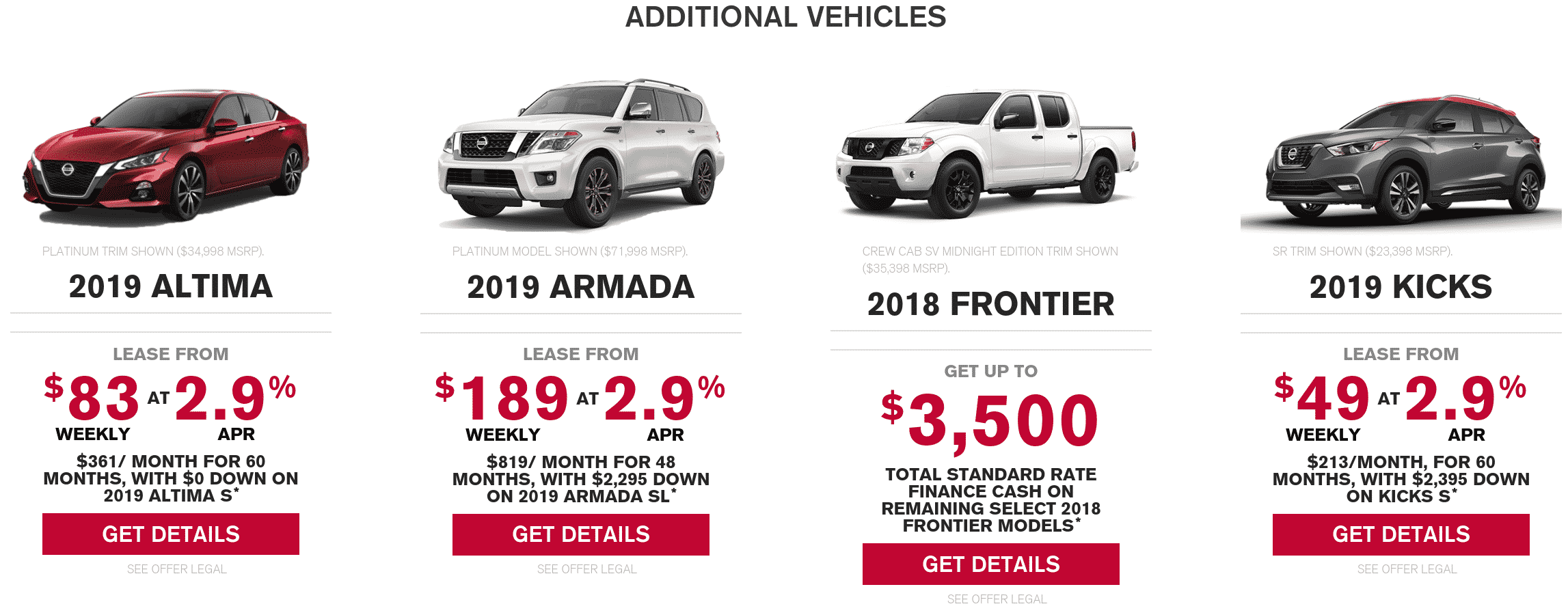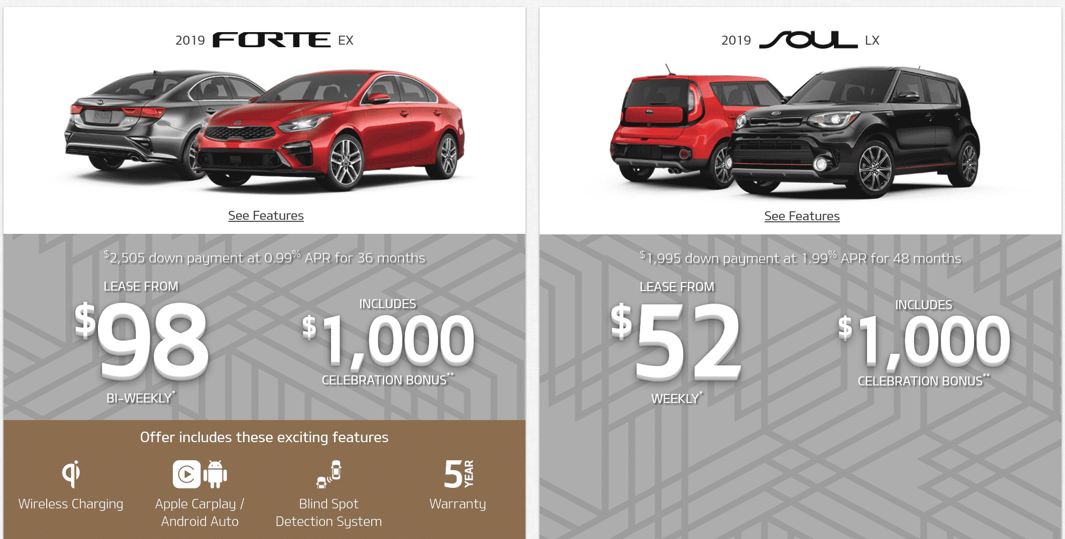 Kia has continued similar programs again from last month, however they have dropped their ‘surprise bonus’ of up to $2000 off certain in stock models. Last month this bonus made their lease offerings considerably more competitive against their competition.