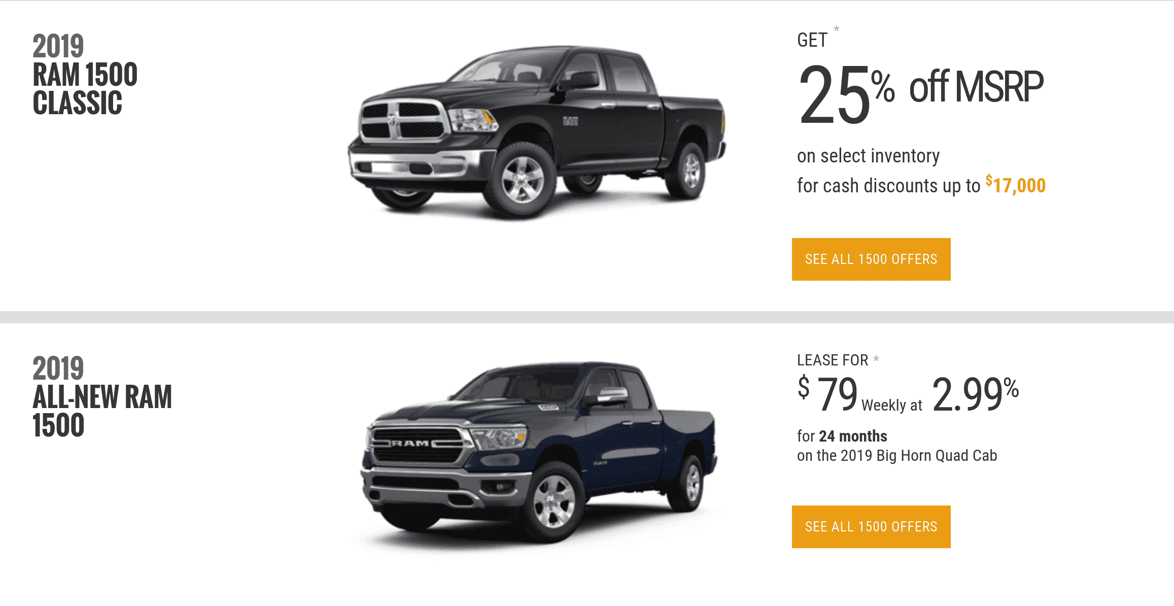 Similar offerings to last month, ensure you call ahead to your Dodge dealership to inquire that they have these Ram BigHorn models in stock that you can claim the lease pricing on. There is limited availability of these vehicles. If you have questions or are looking for a Dodge/Ram dealership or consultant who can answer your questions and help you find one of these trucks, visit here to get paired with an Conquest Consultant. We’re happy to help you find the best new car deals in Ontario.